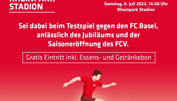 Anlässlich des 25-jährigen Bestehens des Rheinpark Stadion Vaduz, findet am 8. Juli 2023 um 14 Uhr ein Testspiel FC Vaduz vs. FC Basel statt. Bereits um 12 Uhr öffnet das Stadion seine Tore und alle Besucherinnen und Besucher erhalten an diesem Tag ein gratis Getränk und Essen.