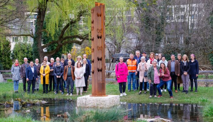 Die Skulptur des gehörlosen Künstlers Peter Hemmi steht neu im Weiher des Naturparks am Gerberweg bei der Liechtensteinischen Landesbibliothek.