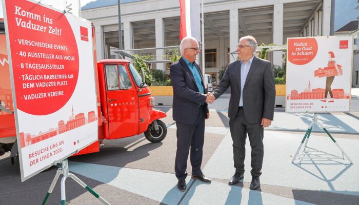 Vaduz ist Gastgemeinde an der LIHGA 2022. Ein Vorgeschmack auf den Auftritt in Halle 6 gibt der Besuch von Bürgermeister Manfred Bischof mit dem Vadolino auf dem Lindaplatz in Schaan. Vorsteher Daniel Hilti heisst Vaduz herzlich willkommen in Schaan.