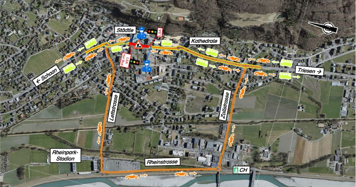 Der Verkehr in Fahrtrichtung Triesen wird über die Lettstrasse, Rheinstrasse und Zollstrasse umgeleitet. Die Zufahrt vom Adlerkreisel ist nur bis zum Busterminal und bis Städtle 28 möglich.