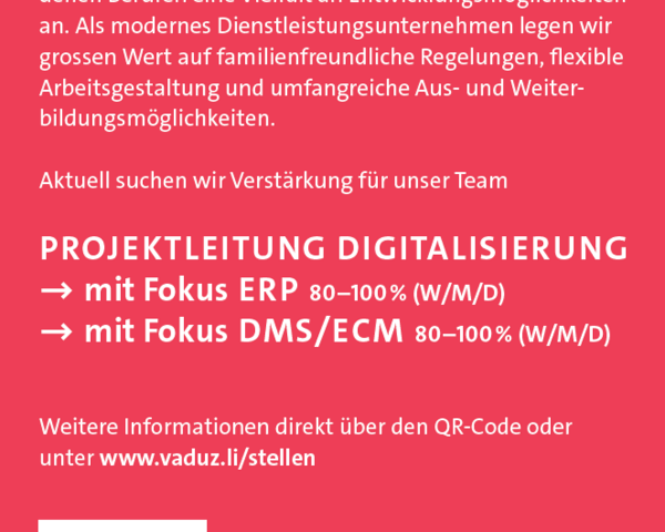 Das Team Digitalisierung Gemeinden Liechtensteins ist in die Organisationsstruktur der Gemeinde Vaduz integriert und arbeitet für alle elf Liechtensteiner Gemeinden. Es leitet und koordiniert das Programm "Digitaler Dienstleister" und spielt eine zentrale Rolle bei der Umsetzung von Anforderungen und Projekten zur Digitalisierung der Gemeindeverwaltungen. Interesse geweckt? Dann gleich bewerben!