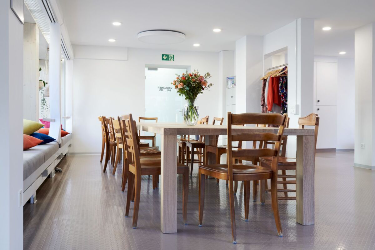 Es ist viel los im «Vadozner Huus». Der Gemeinschaftraum wird rege und spontan von unterschiedlichsten Besucherinnen und Besuchern aufgesucht. Spielende Kinder, lesende Eltern, Jugendliche, die in den Fensterlounges sitzen und das kostenlose WIFI nutzen und mitten drin ein grosser, einladender Holztisch, an dem sich die Menschen miteinander unterhalten.