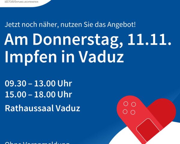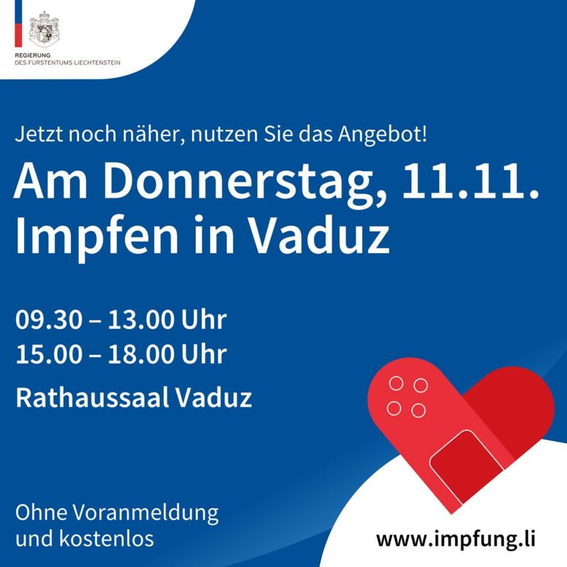 Am 11. November 2021 von 9.30 bis 13.00 Uhr sowie von 15.00 bis 18.00 Uhr können sich alle ganz unkompliziert im Rathaus Vaduz ohne Voranmeldung impfen lassen.