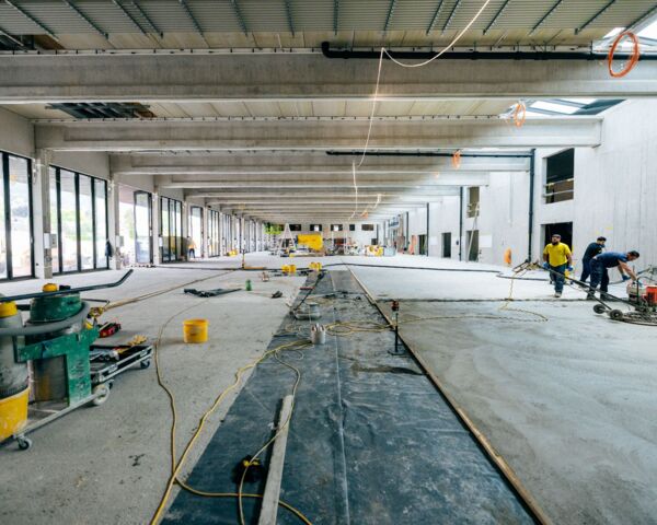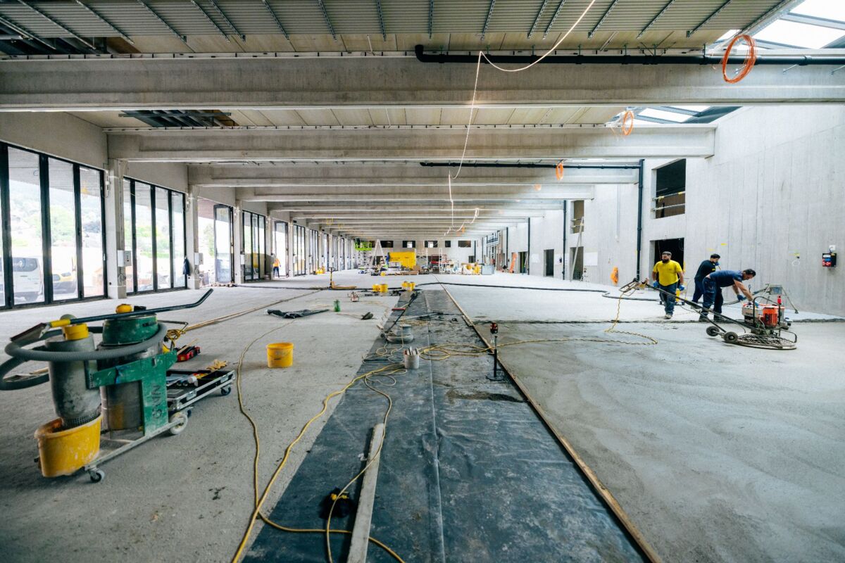 Im Halleninneren laufen verschiedene Arbeiten parallel: Der Boden wird finalisiert, daneben wird an der Hebebühne für bis zu 34 Tonnen schwere Fahrzeuge gearbeitet – hier werden die Einsatzfahrzeuge künftig gewartet und gewaschen.