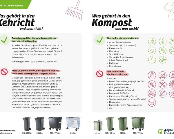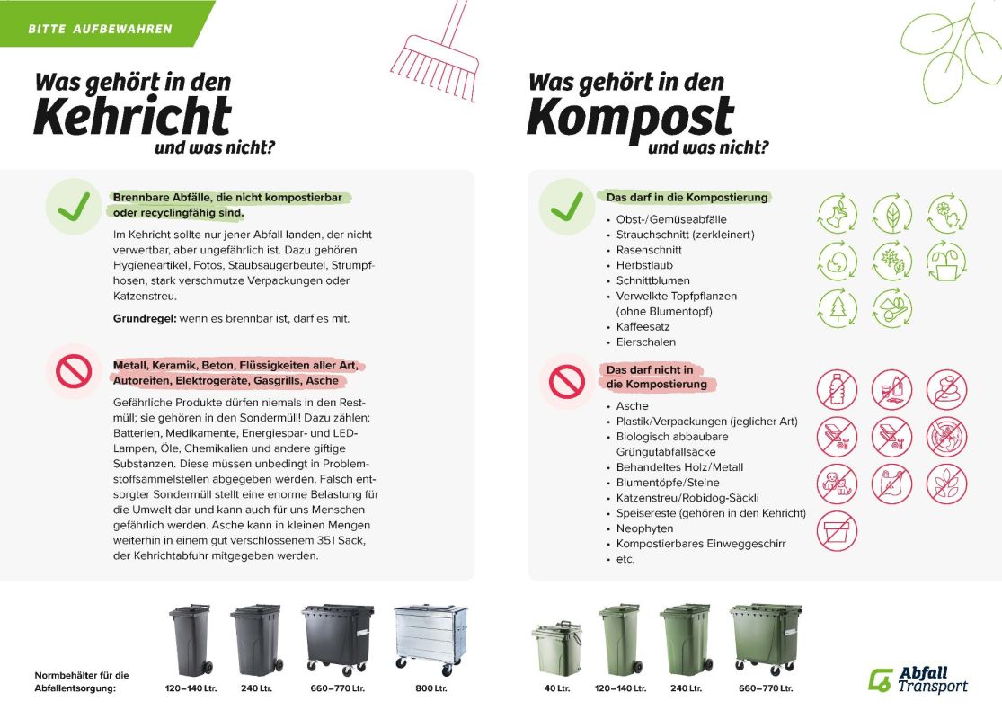 Was gehört in den Kehricht und was in den Kompost? Wie muss ich die Abfallbehältnisse bereitstellen? In einem übersichtlichen Folder sind alle Antworten kurz zusammengefasst.