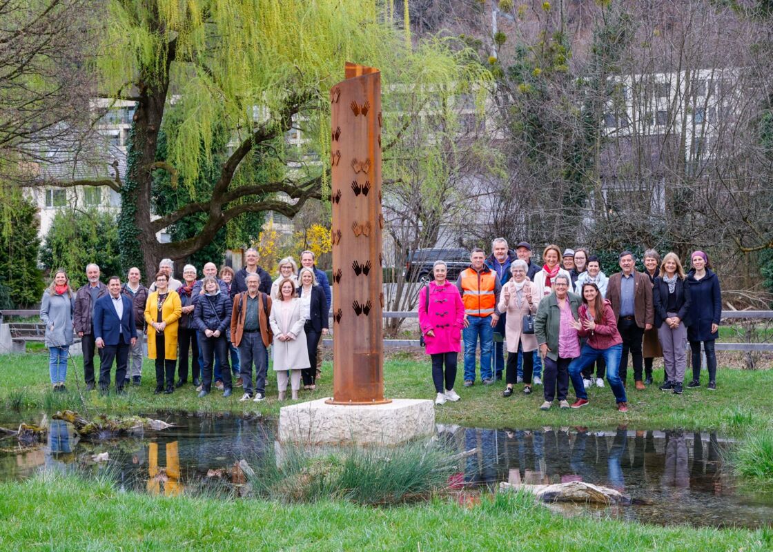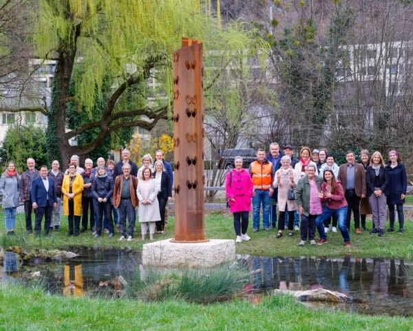 Gestern wurde der neue Standort der Skulptur «Blühende Sprache» feierlich eingeweiht. Die Skulptur des gehörlosen Künstlers Peter Hemmi steht neu im Weiher des Naturparks am Gerberweg bei der Liechtensteinischen Landesbibliothek.