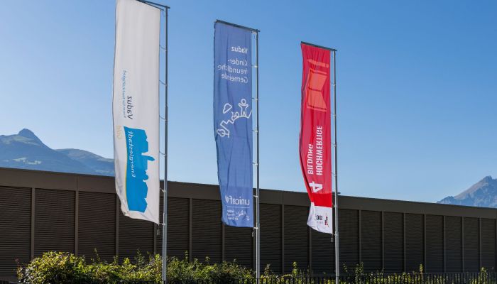 Die Gemeinde Vaduz macht im Rahmen der Kampagne "Flagge zeigen" der SDG Allianz Liechtenstein drei der 17 UN-Nachhaltigkeitsziele (SDGs) sichtbar. Vor der Schule Ebenholz, der Bauverwaltung und dem Rathaus wurden die Flaggen gehisst.