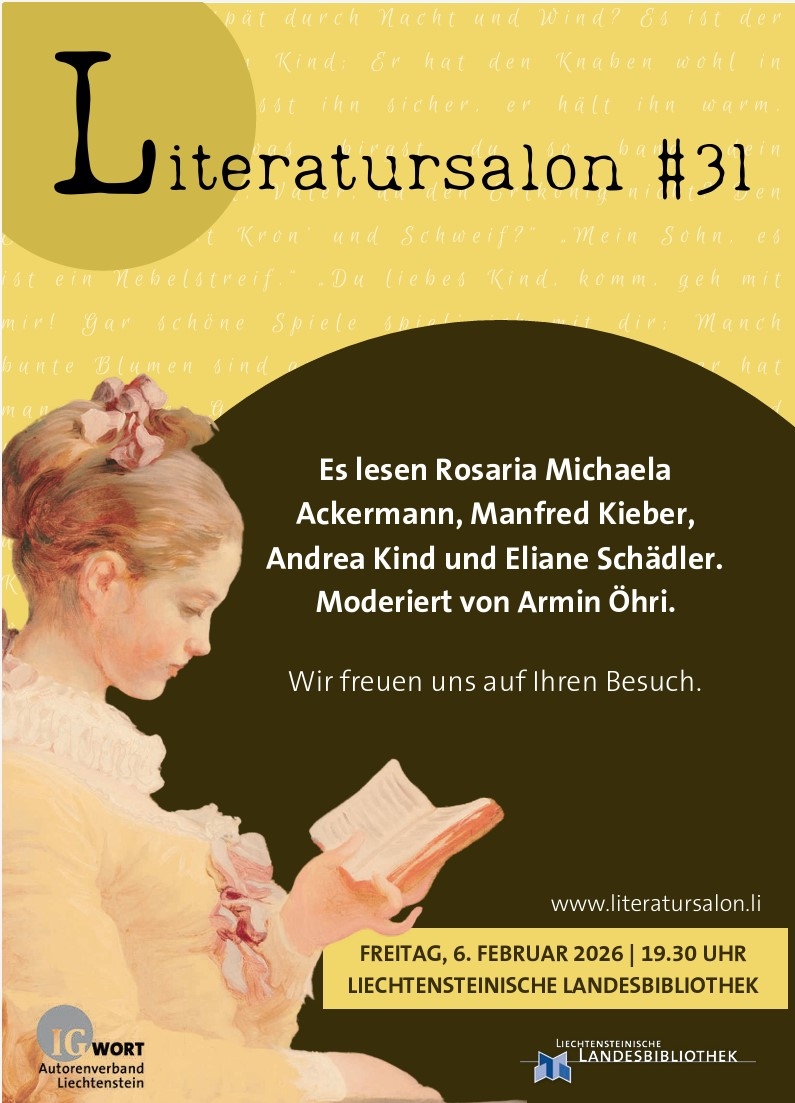 Es lesen Rosaria Michaela Ackermann, Manfred Kieber, Andrea Kind und Eliane Schädler. Moderiert von Armin Öhri.