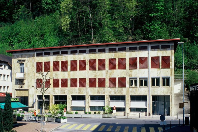 Der sogenannte «Engländerbau» wurde im Jahr 1933 von dem Architekten Erwin Hinderer als Geschäftsgebäude erbaut. Das klar gegliederte dreigeschossige Gebäude weist ein flaches Walmdach auf und ist ein gutes Beispiel der frühen Moderne in Liechtenstein. Der lang gestreckte Stahlskelettbau wurde mit Backsteinmauerwerk ausgeführt und mit senkrecht gestellten Travertinplatten verkleidet. Im Erdgeschoss gliedert sich die westseitige Fassade mit Schaufenstern, wohingegen in den beiden Obergeschossen die Fenster regelmässig angereiht worden sind. Die Fensteröffnungen der Obergeschosse wurden mit Ausnahme der Büroräume im Rahmen eines Kunst am Bau-Projekts mit Füllelementen aus profilierten Blechplatten geschlossen. An der Nordseite des Gebäudes befindet sich ein Treppenhauszylinder, der der Fassade vorgesetzt wurde.