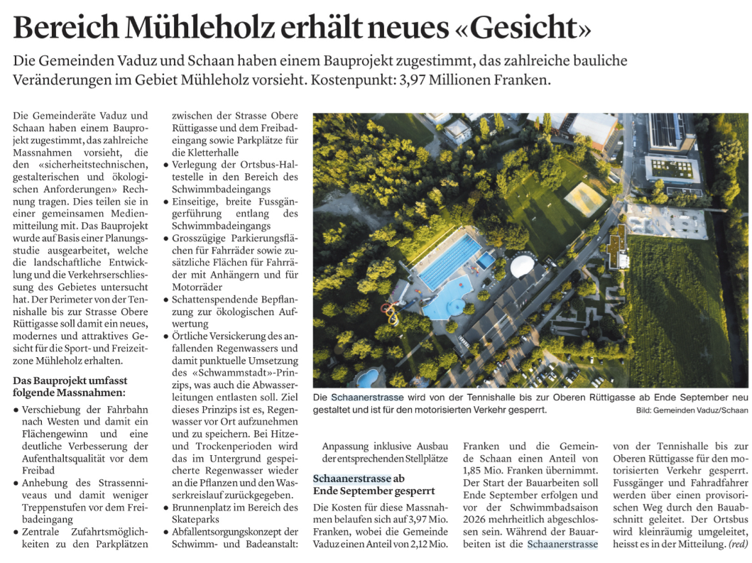 Die Gemeinde Vaduz und die Gemeinde Schaan werden die Schaanerstrasse im Bereich der Schwimm- und Badeanstalt Mühleholz nach dem Ende der Badesaison 2025 umgestalten. Der Abschnitt vom Wasser- und Abwasserwerk bis zur Strasse „Obere Rüttigass“ wird optisch aufgewertet sowie verkehrstechnisch und übersichtlicher umgebaut. Der Bereich ist als Sport- und Freizeitzone Mühleholz ausgewiesen, in welcher bereits diverse Anlagen bestehen und Freiflächen für weitere zur Verfügung stehen.